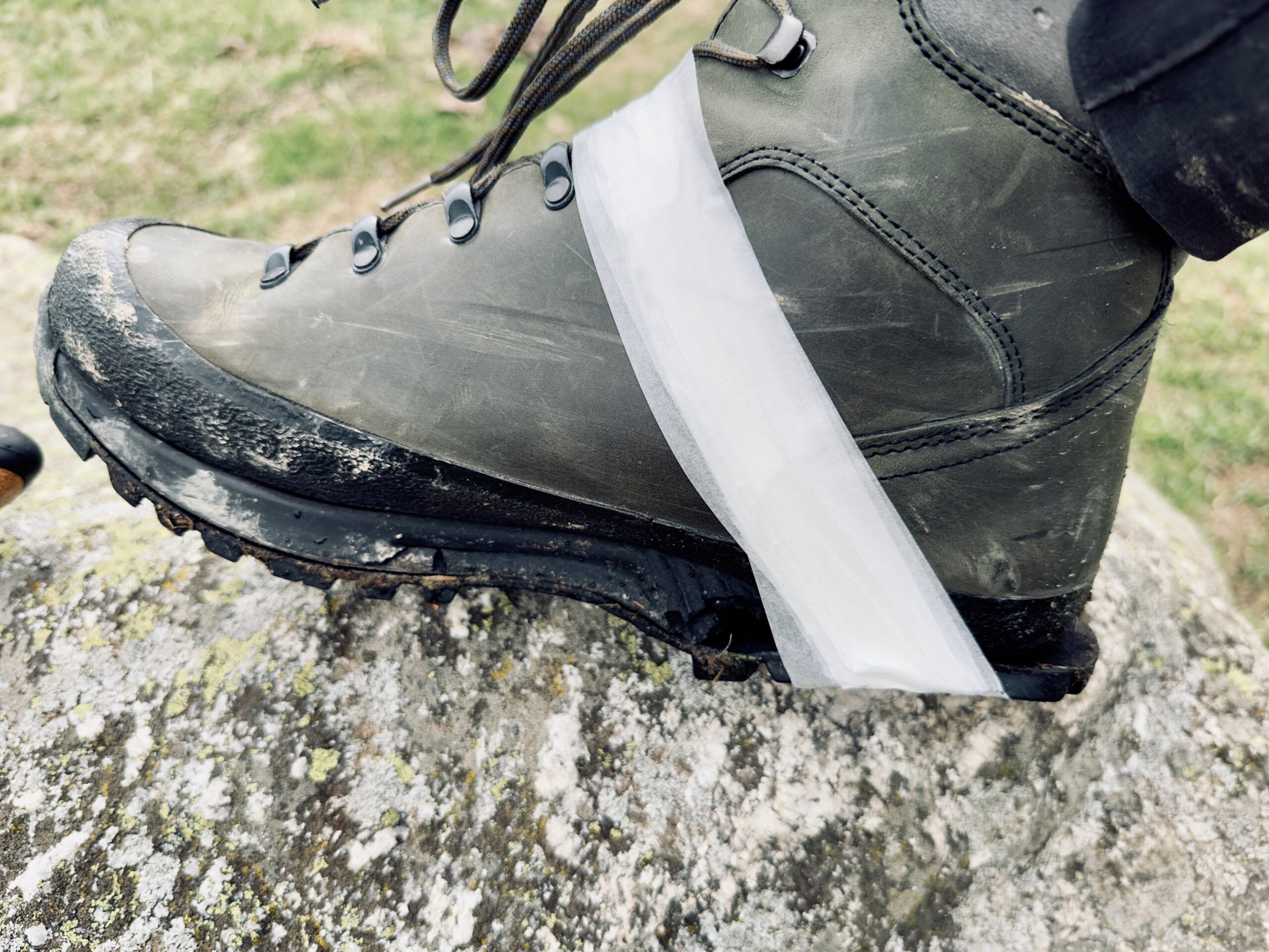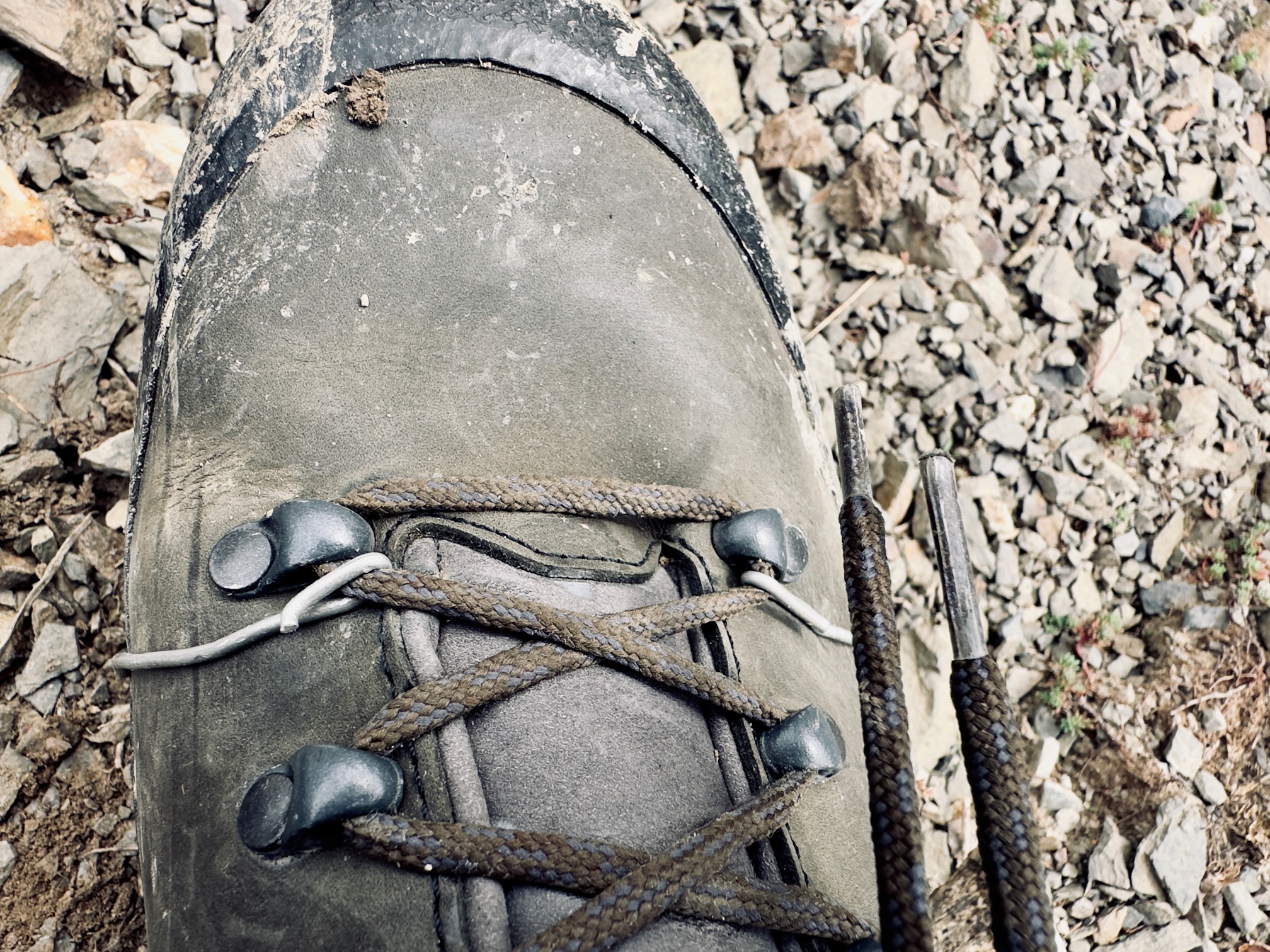 Ein paar Kilometer weiter und das Tape verabschiedet sich. Zudem löst sich jetzt vorne die Sohle auch noch ab. Immer feste drauf, denn ein bisschen Moral hab ich noch. Shit, und jetzt? Was ist das? Auf dem Boden liegt ein Stück Draht und am Rucksack habe ich noch Riemen, die abnehmbar sind. Shit, der Riemen rutscht immer wieder über die Sohle aber immerhin passt der Draht. Ein Stück Baumrinde liegt hier auch noch, vielleicht verschafft das den nötigen Grip für den Riemen?