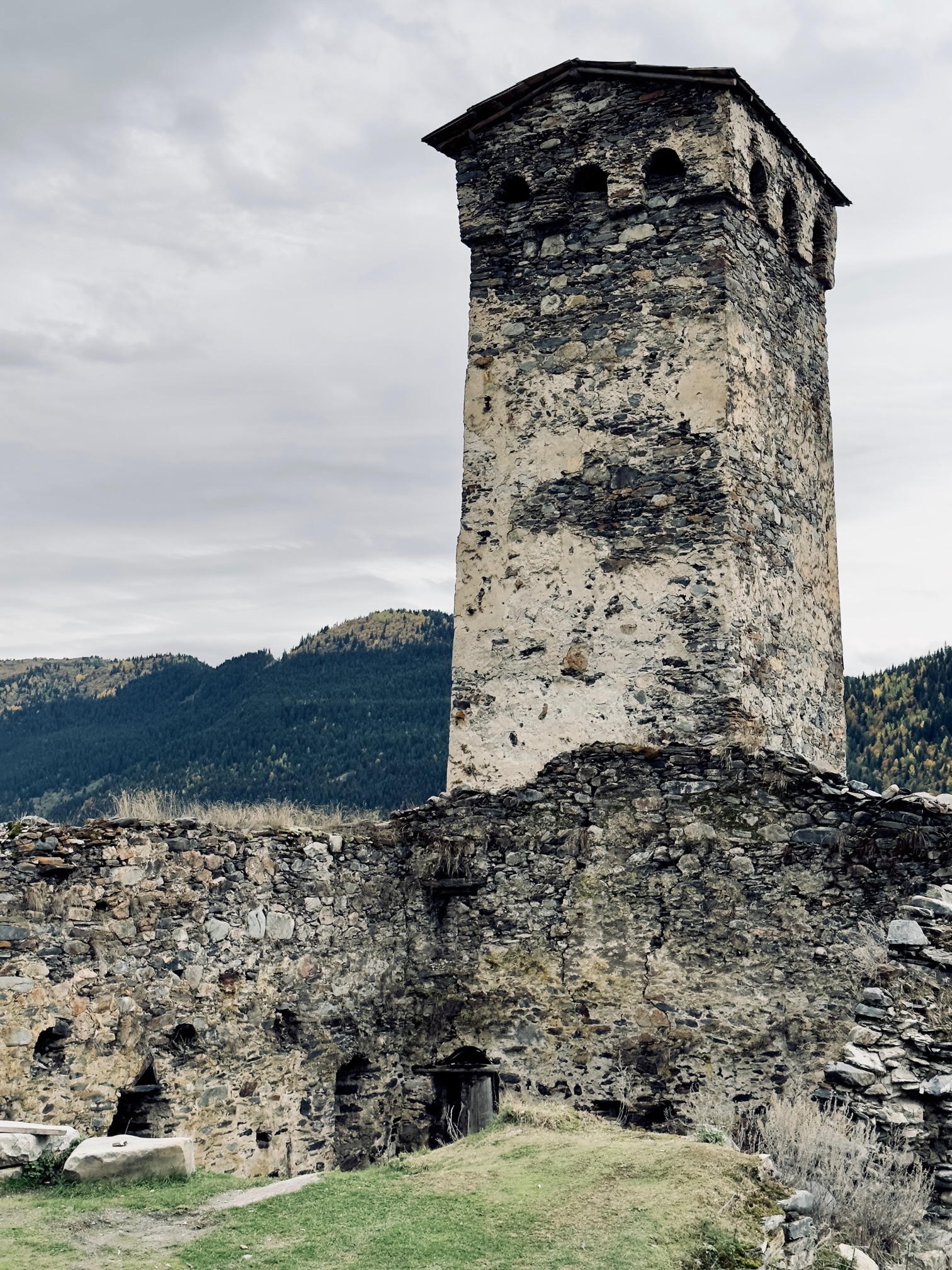 Es geht zwar schon die ganze Zeit bergauf, aber kurz vor einer Ruine muss ich rechts abbiegen und einen wesentlich steileren Anstieg hoch. Zeit die Trekkingstöcke auszupacken und zu probieren, ob der Hype real ist. Spolier Alert, er ist es. Die Dinger machen den Anstieg merklich angenehmer. Ich bin überzeugt. Noch überzeugter bin ich, als es dann noch steiler wird und der Weg zu einem schmalen Pfad wird. Hier geht es definitiv nur noch zu Fuß weiter. Was ein Weiterkommen überhaupt möglich macht sind Wurzeln und Steine, die stufenartig hier und da aus dem Boden ragen und damit Fläche für einen Fuß bieten. Ohne die, wäre das sehr spannend und nicht ganz ungefährlich geworden. Fallen sollte man hier besser vermeiden. Herr Sandhorst fasst nach guten 2 Stunden nach dem Verlassen von Mestia, davon gute 20 Minuten auf dem “Treppenanstieg”, zusammen: