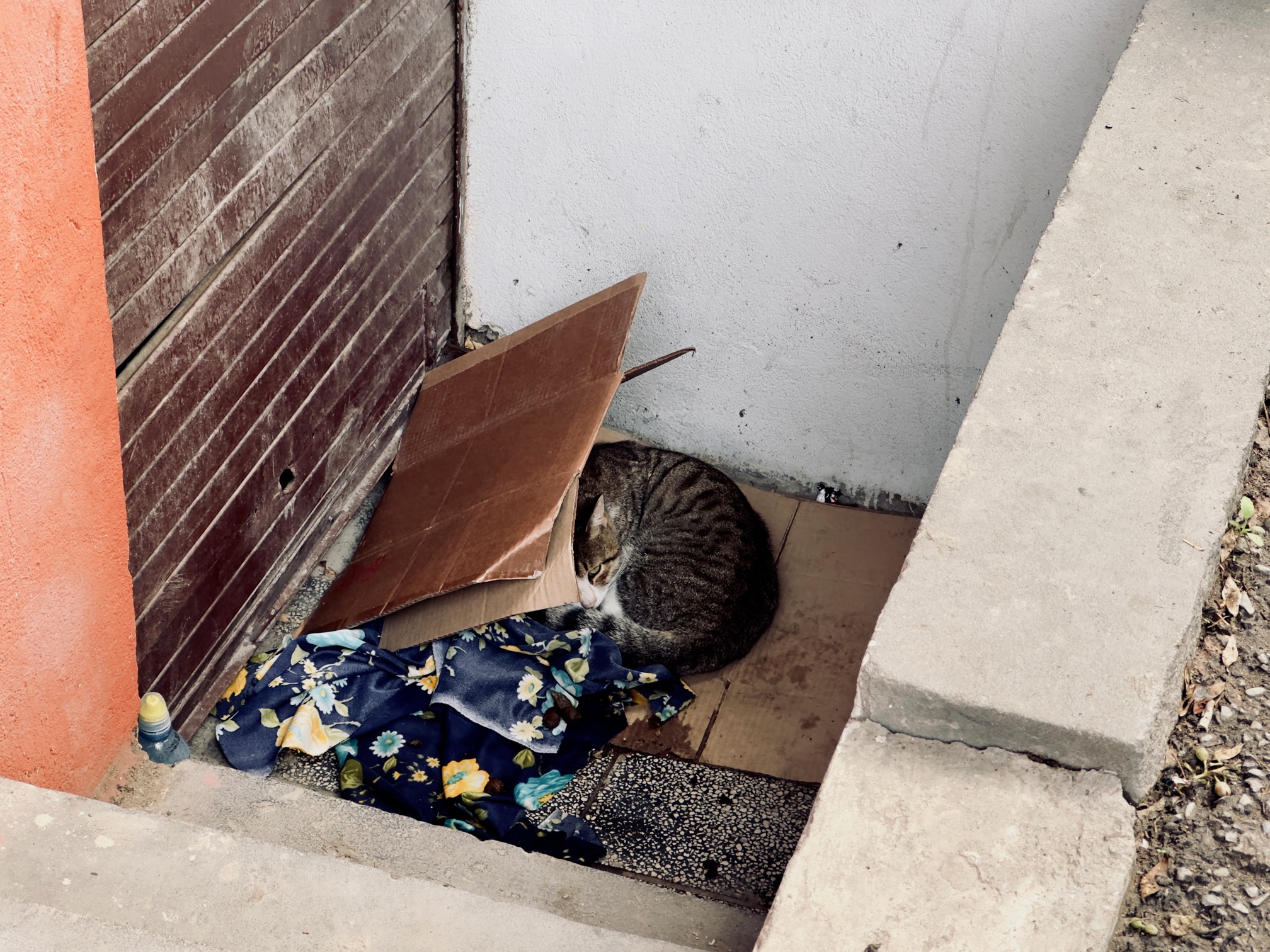 Stattdessen entdecke ich in einem Abgang neben einem Haus, daß jemand für eine der vielen streunenden Katzen ein kleines Heim improvisiert hat.