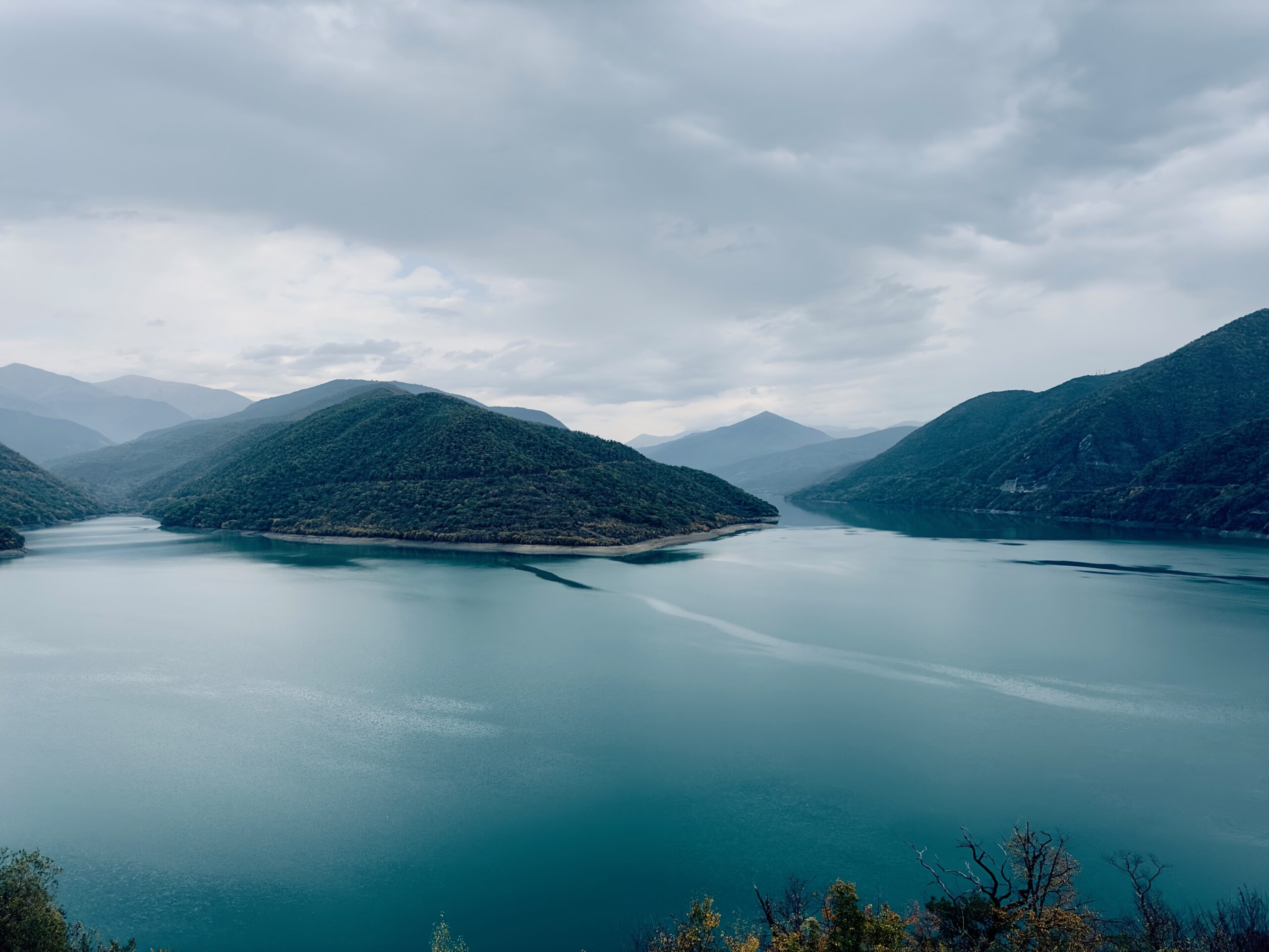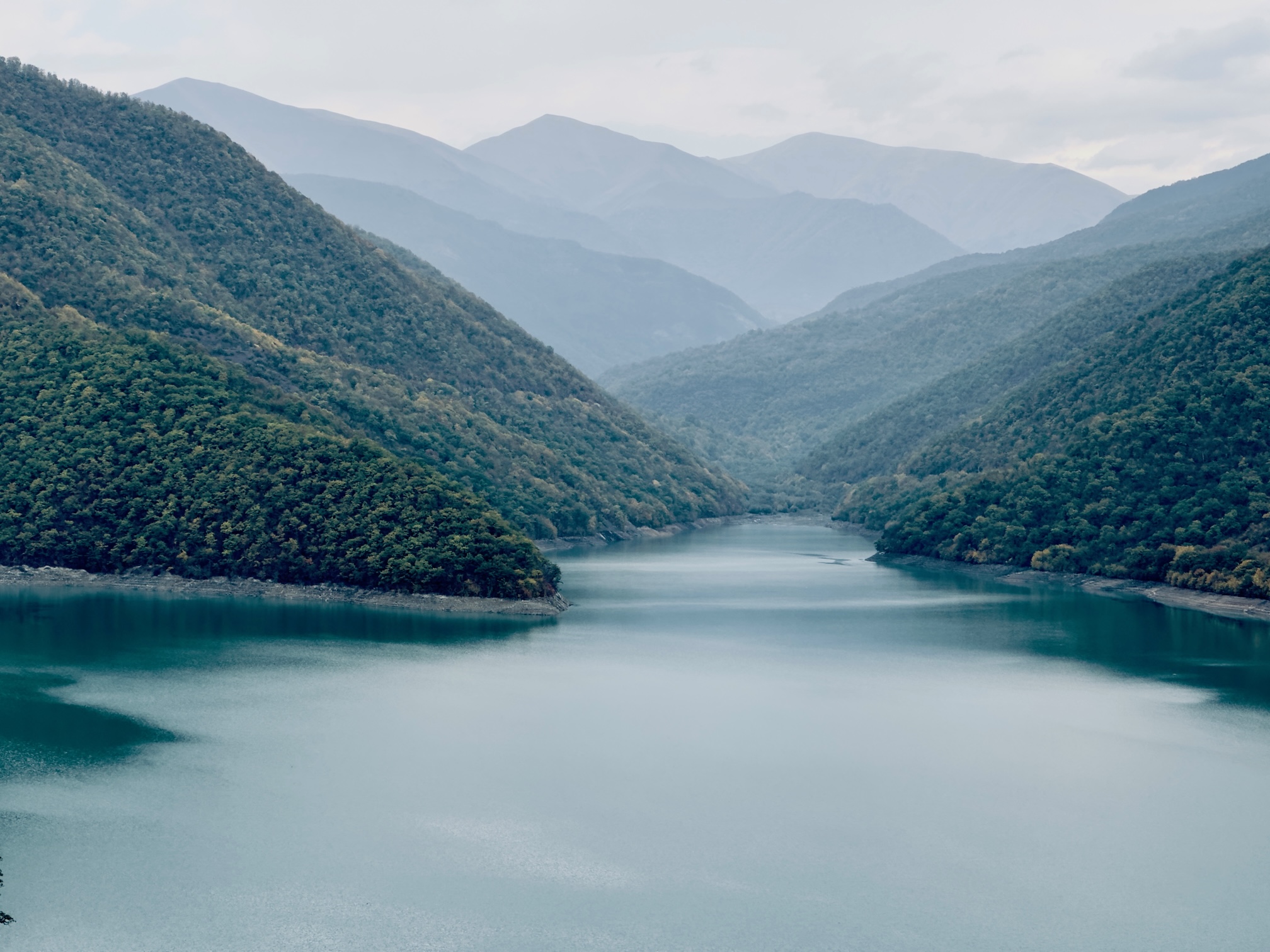 Erster Stop ist das Zhinvali Reservoir. Eine ganze Kleinstadt aus Shops hat sich um den Aussichtspunkt versammelt. Hier wird alles angeboten. Pflegeartikel, Kleidung, Essen, Getränke, Souvenirs und jede Menge Mineralwasser mit Kohlensäure. Palettenweise steht das Zeug rum. Giorgi erklärt, daß das in Russland vergleichsweise teuer sei und die Trucker sich deshalb hier trägerweise eindecken. Gutes Geschäft, weshalb die Verkäufer hier natürlich aufgestockt haben.