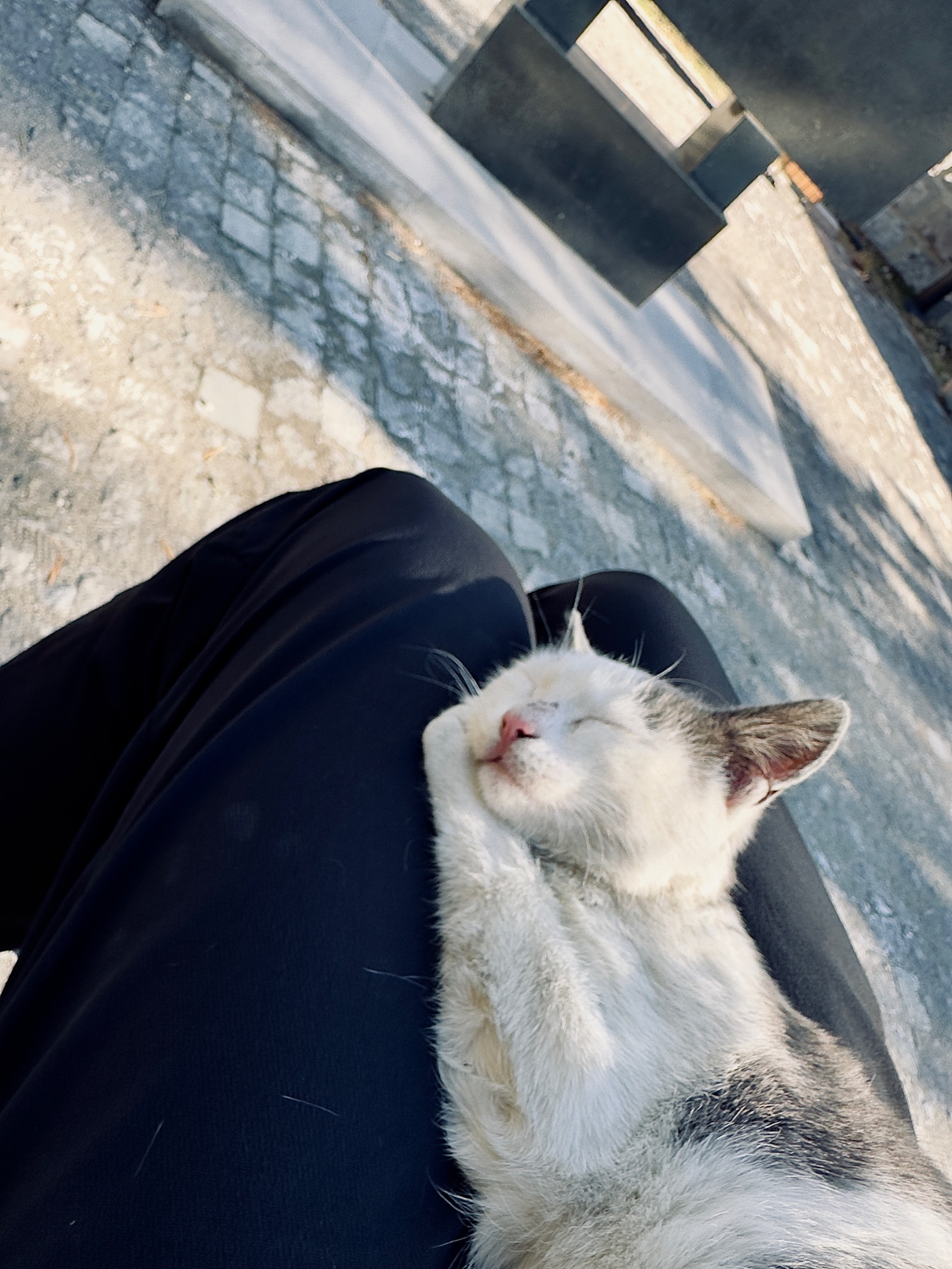 Es ist später Nachmittag und ich habe noch nichts gegessen. Also heißt es Restaurant suchen, nur welches? Ich setze mich auf eine Bank und bemühe Google Maps mir doch bitte ein paar Optionen anzuzeigen. Während ich mich also durch die Möglichkeiten scrolle, bekomme ich plötzlich Besuch von einer streunenden Katze, die sich ohne große Ankündigung oder ein Miau einfach auf mich setzt. Damit verschiebt sich mein Essen um eine gute Stunde, den die Gute schläft einfach ein und ich bringe es nicht über’s Herz sie zu wecken.